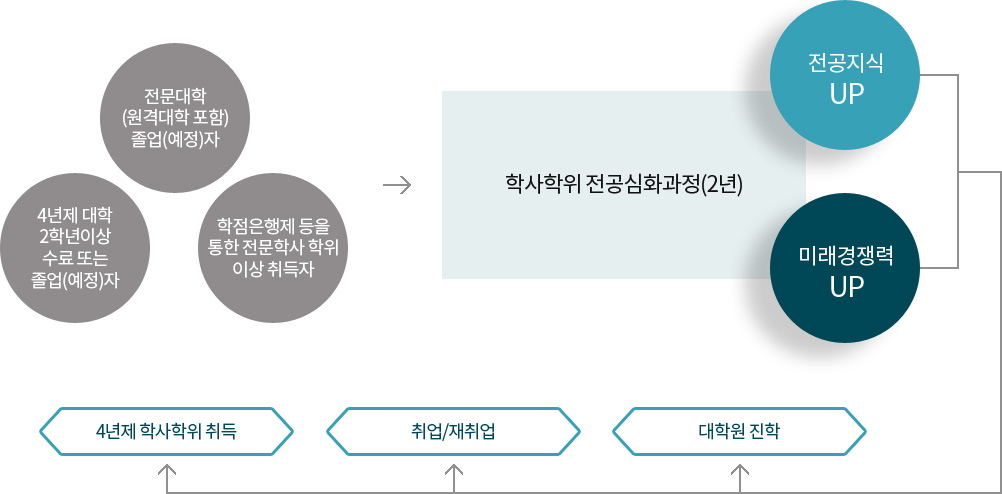 전문대학 졸업(예정) 또는 이와 동등 이상의 학력이 있다고 인정된 자에게 계속교육 기회를 제공하여 실무와 연계된 직업심화교육을 통해 평생학습사회 구현과 전문기술인력 양성 및 4년제 대학교 졸업자와 동등한 학사학위를 수여하는 교육제도입니다.